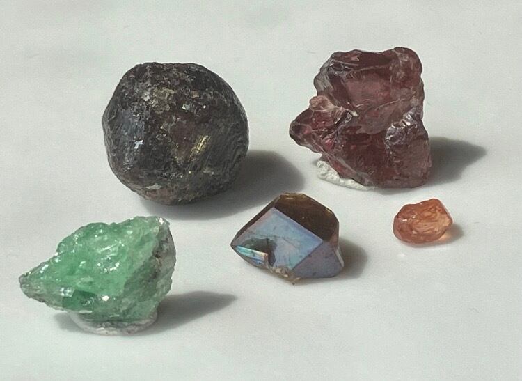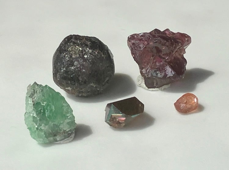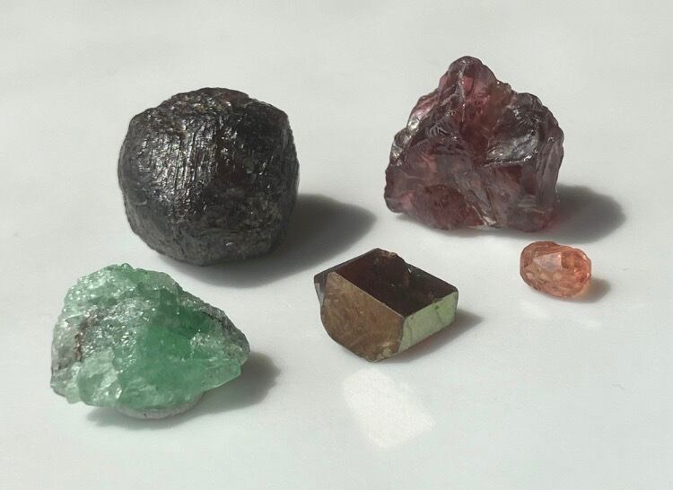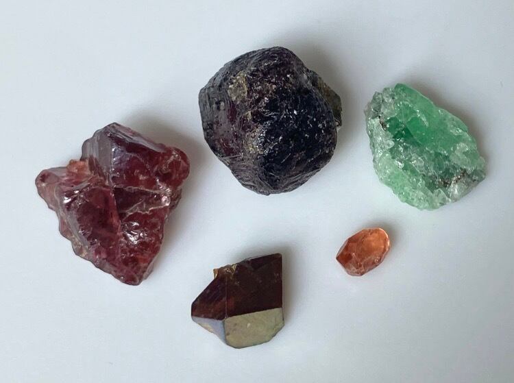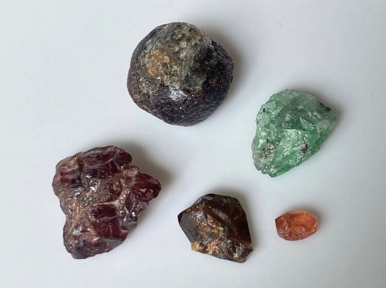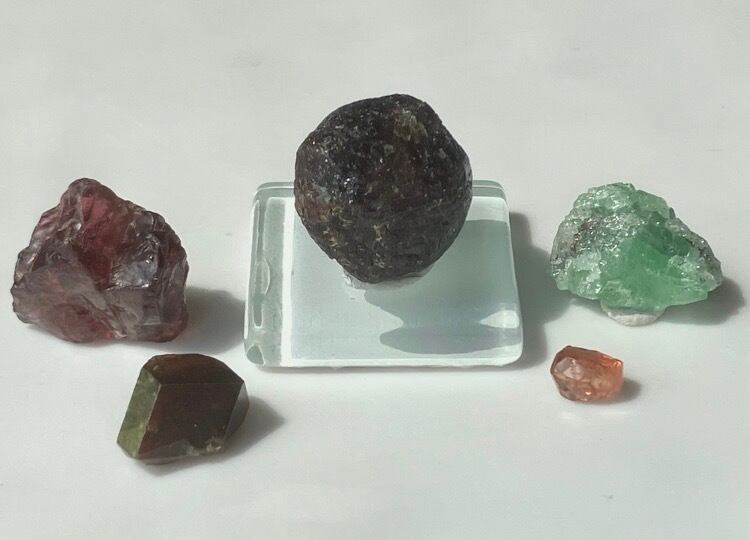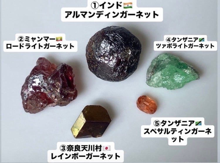 アルマンディン、ロードライト、レインボーガーネ、ツァボライト、スペサルティン他 ガーネット原石 5個セット② 台座付