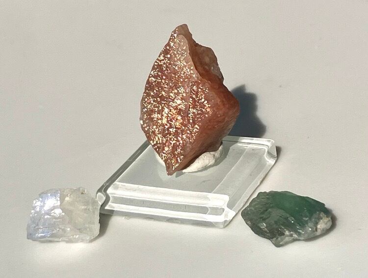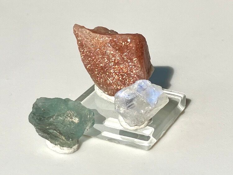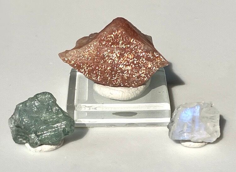お得 サンストーン、レインボームーンストーン、アルーシャグリーンフェルスパー 長石類原石 3個セット ② 台座付